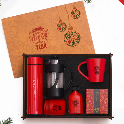 Sürekli kullanılabilir 36x26 cm dekoratif ahşap kutu içinde özenle hazırlanmış premium kahve ve yeni yıl konseptli hediye seti. Hem kahveseverler hem de özel günlerde hediye vermek isteyenler için kusursuz bir seçimdir.